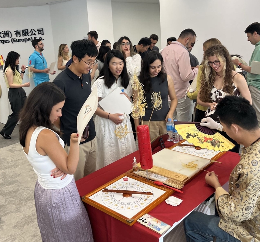 此次活動不僅準備了豐富的節日美食,包括香甜可口的中式糕點與傳統粽子,還特別設置了兩項沉浸式中華傳統文化體驗項目:書法和糖畫制作。在書法體驗區,員工們根據個人喜好,向書法老師定制了自己的中文名字和祝福語作為紀念,同時近距離感受漢字書法的獨特魅力;在糖畫制作區,糖畫藝人現場展示傳統技藝,用糖液勾勒出生動的圖案,員工們駐足欣賞精湛的制作過程,紛紛感嘆這一中國非遺技藝的精巧與趣味。整個活動氣氛熱烈,笑聲不斷。許多外籍員工表示,這是他們第一次近距離沉浸式地體驗中國傳統文化,印象深刻,同時也更加增進了對中國的興趣和認同感。